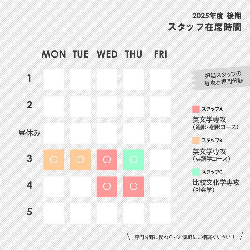 【変更】2025年度後期ライティング・サポートのスケジュールについて 投稿日時 : 11/10 kclibrary 10月6日に投稿した時間割について、担当者が一部変更になりましたので、お知らせします。確認のうえ、ご来館ください。